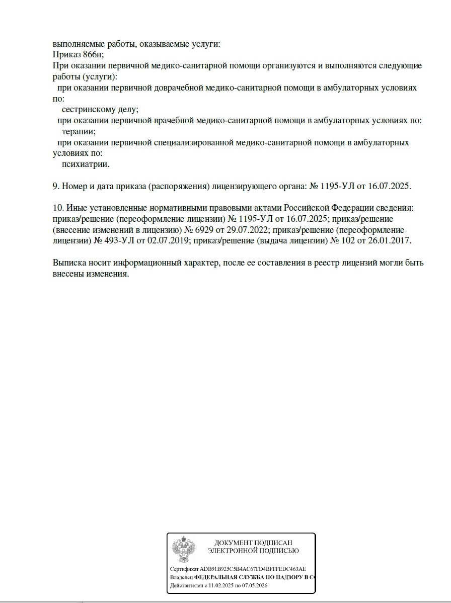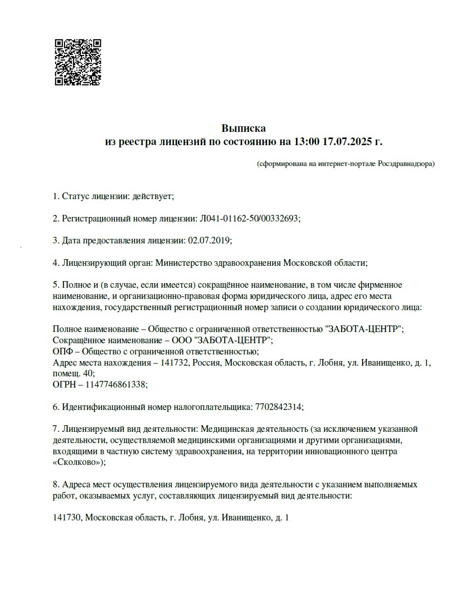 Медицинская лицензия № Л041-01162-50/00332693 от 02.07.2019 г., срок действия – бессрочно